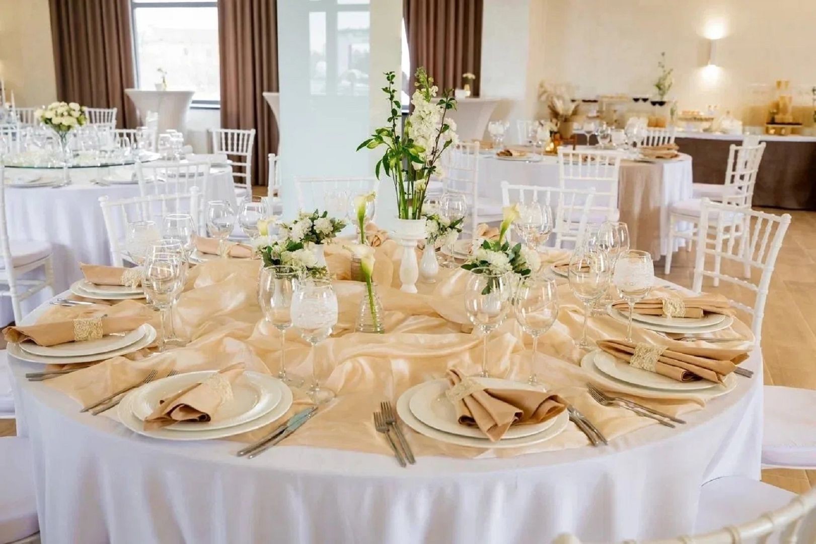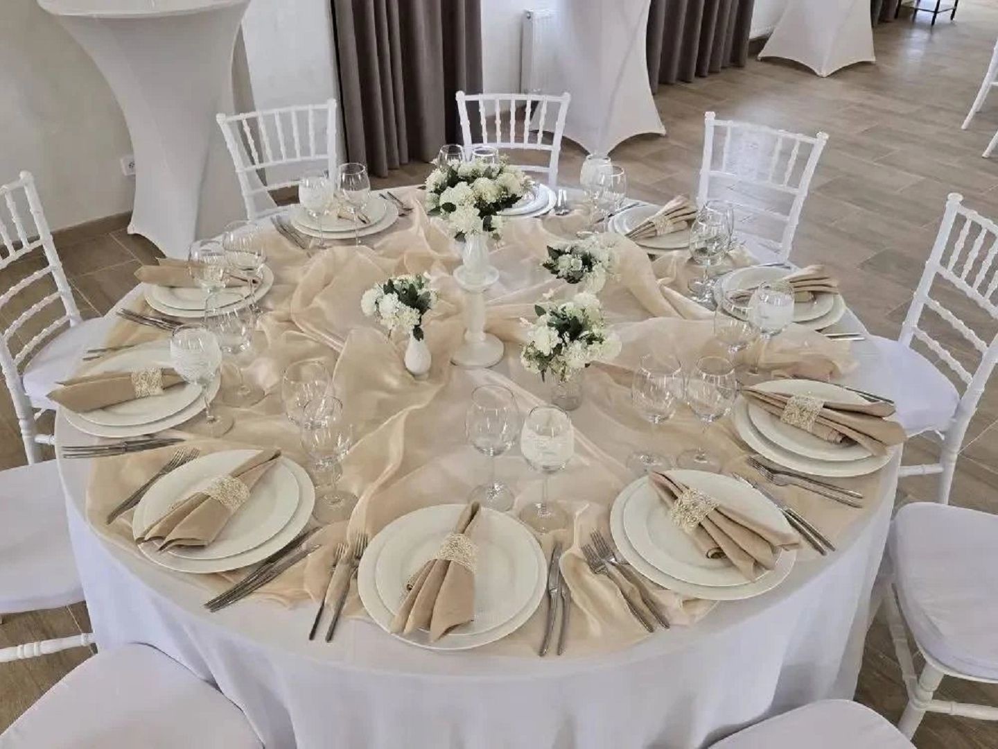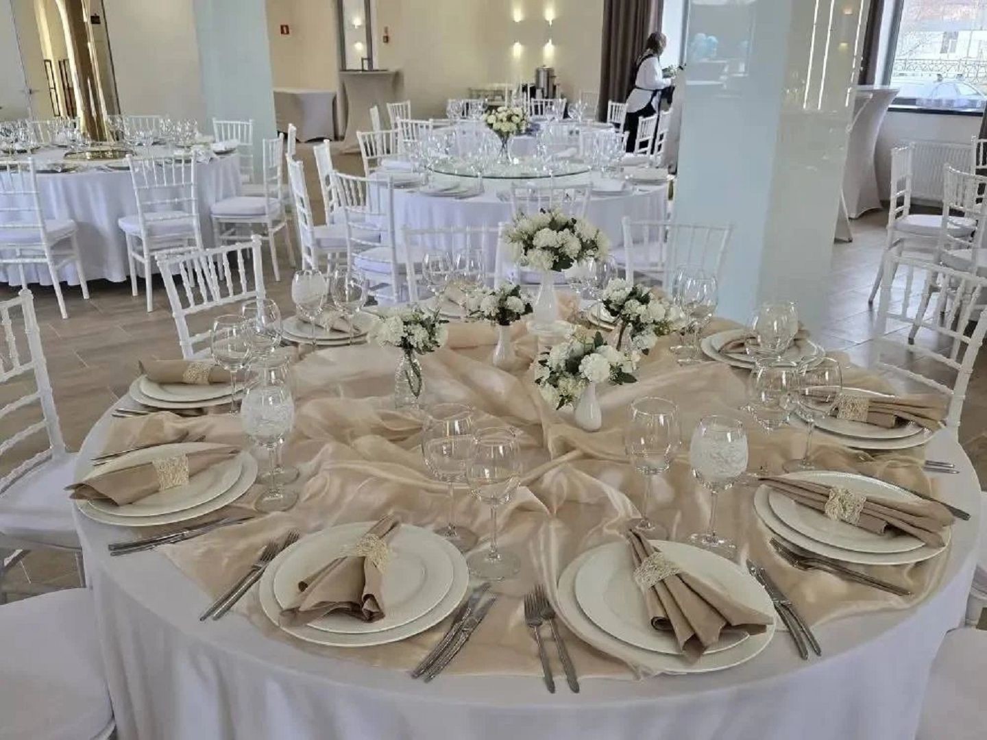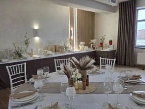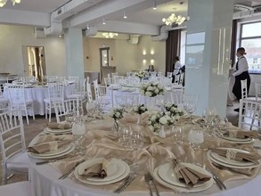 На первом этаже двухэтажного особняка расположился банкетный зал в современном стиле. Здесь можно устроить банкет вместимостью до 80 человек или фуршет до 100 персон. Просторное помещение позволит провести развлекательную программу с танцами, конкурсами, выступлениями музыкантов и артистов.